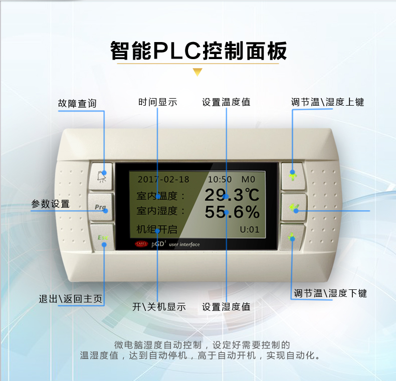 3、高性能電子電極加濕器:不滋生細菌,對室內空氣無污染;對水質無特殊要求,無需水處理;獨立加濕器控制板,自動定時換水清洗,延長使用壽命,能自動根據加濕要求控制水位及加濕電極電流,實現高精度控制,真正滿足高精度要求;